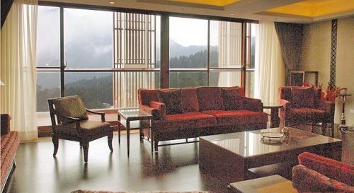 臺灣阿里山賓館總統(tǒng)套房客廳配有價值百萬新臺幣的檜木家具和擺飾,從房內(nèi)可眺望山景。(圖片來源于臺媒)