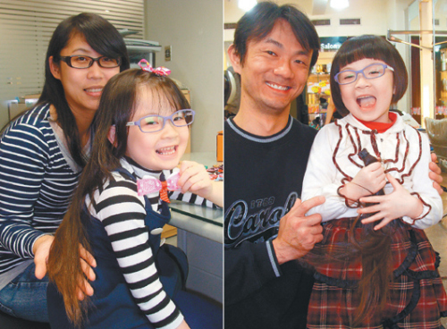 五歲女童李淯鈞捐出及腰長發(fā)幫助癌童;兩年前也曾捐發(fā)的林保妙(左圖左)特地送她自制發(fā)夾,讓李淯鈞笑開懷。李淯鈞在農(nóng)歷生日當(dāng)天,剪下留了五年的及腰長發(fā)要捐助癌童。圖片來源:臺灣《聯(lián)合報》
