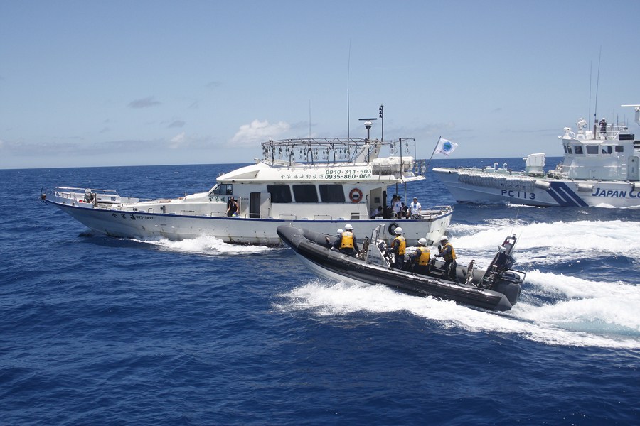 7月3日,世界華人保釣聯(lián)盟9人向釣魚島出發(fā)。據(jù)日本共同社7月4日報道稱,經(jīng)日本第11管區(qū)那霸海上保安部確認(rèn),臺灣“活動家”乘坐的漁船駛?cè)肓酸烎~島附近“日本領(lǐng)!薄D為日方巡邏船與“保釣”漁船交涉。