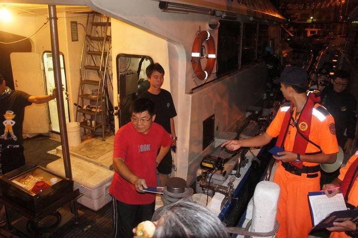 圖為7月3日晚,臺灣“海巡署”的長官正在進(jìn)行安檢。