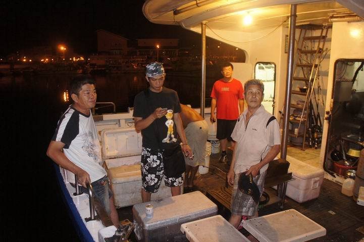 7月3日晚11點20分,世界華人保釣聯(lián)盟主席黃錫麟,理事張春明及會員游嘉文等,乘坐全家福六號向釣魚島出發(fā)。圖為保釣人士張春明,黃錫麟,游嘉文,游明川(由右至左)。