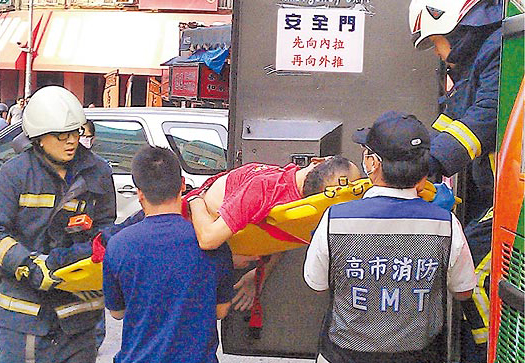 消防人員將昏迷的司機李志明從學(xué)生專車后方安全門抬下送醫(yī)。(圖片來自臺媒)