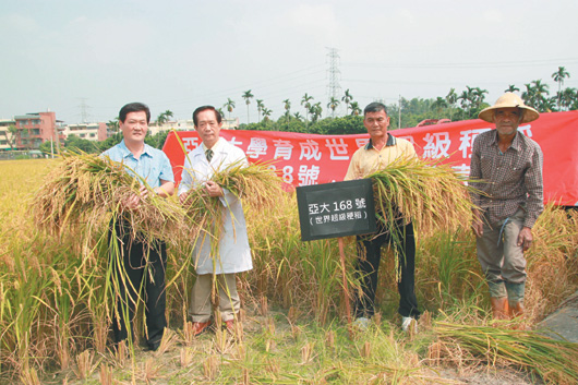 東南網(wǎng)10月10日訊 據(jù)臺(tái)灣媒體報(bào)道,亞洲大學(xué)健康學(xué)院院長(zhǎng)林俊義(左二)費(fèi)時(shí)五年,經(jīng)過(guò)八代育種選拔,從上萬(wàn)支雜交稻穗中,育成稻稉粗硬、有淡淡玉米清香的“亞大168號(hào)超級(jí)稉稻”,且收成量大幅提升,農(nóng)民每公頃可增加近8萬(wàn)元新臺(tái)幣產(chǎn)值。新品系稻米昨天收割,林俊義和農(nóng)民并肩站在田間,一臉欣喜說(shuō),“他有信心,超級(jí)稉稻在目前世界各稻種中,產(chǎn)量居冠軍”。