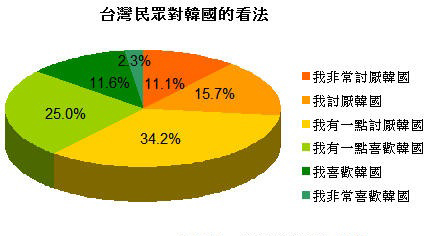 研究公司調(diào)查顯示,61%的臺(tái)灣民眾討厭韓國(guó),其中更有11%的民眾表示非常討厭韓國(guó)。來源:臺(tái)灣今日新聞網(wǎng)