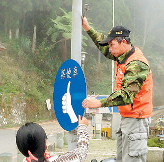 據(jù)臺灣《聯(lián)合報》報道,臺灣玉山、日月潭、墾丁、奮起湖等7個風景區(qū)主要道路上,在一個月前陸續(xù)出現(xiàn)了9個“搭便車”的招牌,藍底白字,上方是豎起拇指的圖示,下方是“HITCHHIKE”(搭便車)的文字,簡潔明了。據(jù)悉,這都是正在讀研究生的陳冠銓所為。