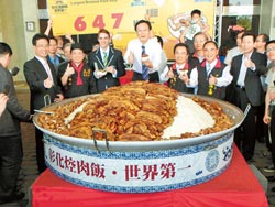 16日最大碗焢肉飯的吉尼斯世界紀(jì)錄在彰化誕生,破紀(jì)錄后食物被分裝成5千份送給觀眾品嘗。(圖片來源:臺(tái)灣《中國時(shí)報(bào)》)