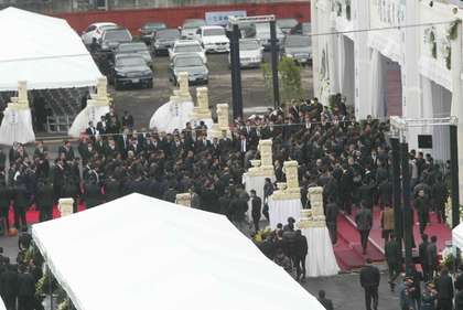 天剛微亮,告別式會(huì)場(chǎng)已有不少黑衣人集體進(jìn)出。(圖片來自臺(tái)媒)