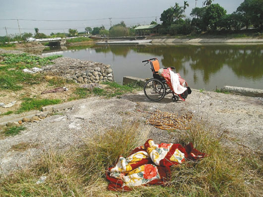 警方及家人上午在德元埤湖畔發(fā)現(xiàn)空的輪椅及丟棄在地上的毛毯,并在池里撈出2人尸體。圖自臺灣《聯(lián)合晚報》