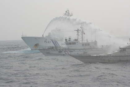 中國臺灣網(wǎng)1月24日消息 據(jù)臺灣媒體報道,今天凌晨1時46分,臺灣保釣人士帶著一尊大甲媽祖神像,搭乘“全家福”號漁船從新北市深澳漁港出發(fā),10時32分進(jìn)逼釣魚島28海里處時,遭日艦噴水柱,甚至排放黑煙、造浪等方式驅(qū)趕,臺灣艦艇上前阻擋,也以水柱反擊。