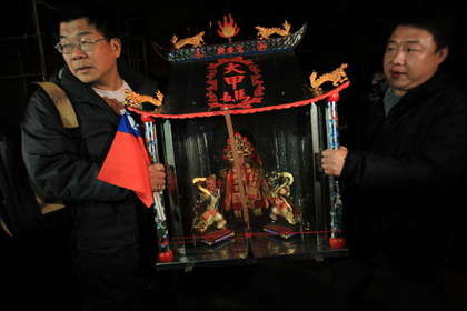 臺灣保釣協(xié)會秘書長黃錫麟(左)、理事長謝夢麟(右)帶著媽祖神像抵達(dá)新北市深澳漁港。(圖片來自臺媒)
