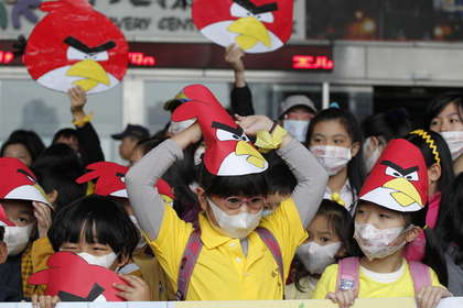 不少學(xué)生拉起布條抗議,學(xué)生頭綁憤怒鳥面具、拿著海報(bào)抗議廢校