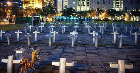 臺(tái)北市政府交通局交通治理科表示,公用自行車需要透過(guò)停車柱來(lái)計(jì)費(fèi)、?浚桓\囍赏??jī)奢v自行車,所以造型設(shè)計(jì)有點(diǎn)像“十字架”。網(wǎng)絡(luò)上的照片是拍到自行車大多被租出的景象,又因燈光色調(diào)問(wèn)題,才造成外觀有點(diǎn)像“墓地”。(中國(guó)臺(tái)灣網(wǎng) 焦源源)