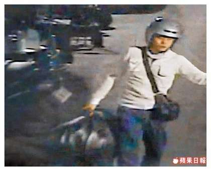 陳佳富頭戴安全帽,手提三大袋不明物,獨自從住家附近巷弄走出。(圖片來自臺媒)