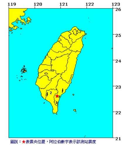 中國(guó)臺(tái)灣網(wǎng)3月20日消息 據(jù)臺(tái)灣媒體報(bào)道,臺(tái)東縣金峰鄉(xiāng)今天下午2時(shí)05分發(fā)生里氏3.9級(jí)地震,震源深度14.2公里。其中,最大震度4級(jí),出現(xiàn)在臺(tái)東太麻里,此外,屏東縣三地門震度有2級(jí),屏東市有1級(jí)。(中國(guó)臺(tái)灣網(wǎng) 李帥)