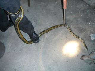 消防隊員接到民眾求助電話,報案民眾說有蛇盤在屋梁上,消防隊員到場查看這只蛇體型巨大,連捕蛇夾都無法控制,只好穿上防護(hù)裝備改以徒手上陣,抓到一只2.5米的黑眉錦蛇。從體型研判應(yīng)該是懷孕的母蛇,捕抓的過程中頻頻吐信,意圖攻擊消防隊員。