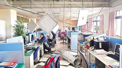 臺中市政府陽明大樓5樓辦公室,昨在地震劇烈搖晃下,天花板掉落一大片。(圖片來自臺媒)