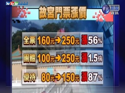 臺北故宮日前宣布票價即將漲價,普通票自160元(新臺幣,下同)漲到250元,優(yōu)惠票從80元調(diào)漲到150元,漲幅8成。團體票漲更兇,從100元漲到250元,更是漲了1.5倍。