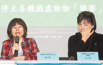 臺(tái)灣動(dòng)物研究會(huì)主任陳玉敏(左)與臺(tái)灣蠻野心足生態(tài)協(xié)會(huì)秘書長(zhǎng)林子凌(右),昨天看到原住民在祭典中的“抓雞”與“抓豬”畫面,忍不住落淚。圖片來自臺(tái)灣《聯(lián)合報(bào)》