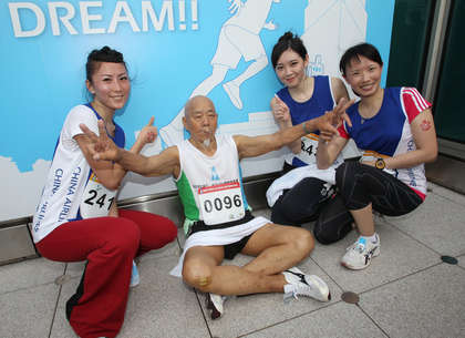 高齡96歲的彭宏年抵達(dá)終點(diǎn)時(shí),贏得全部參賽者的熱烈掌聲,連在一旁參賽的空姐團(tuán)也爭(zhēng)相與他合照。彭宏年稍微休息之后接受訪問,他說平常就有運(yùn)動(dòng)的習(xí)慣,每一屆都會(huì)來參加,跑完的感覺“當(dāng)然很累啊!”