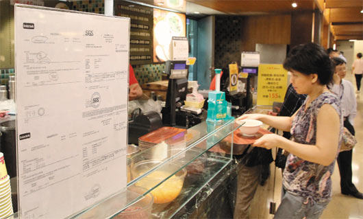 臺北市府衛(wèi)生局昨天首波針對有販賣與供應粄條、肉圓等八大類產(chǎn)品的餐飲業(yè),輔導業(yè)者在明顯處張貼安全證明,讓消費者安心。圖片來源:臺灣《聯(lián)合報》