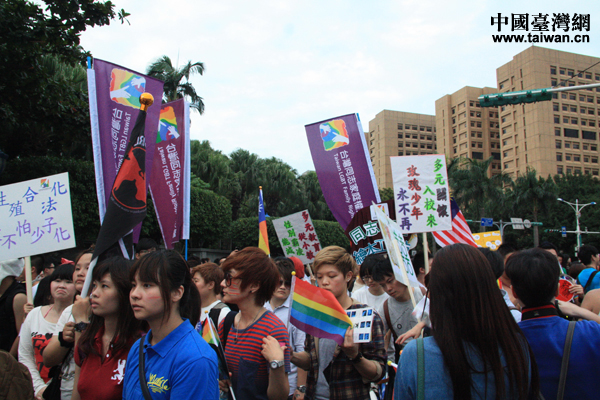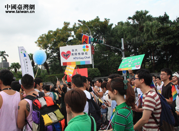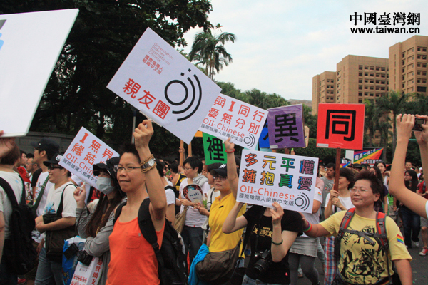 2012年10月27日,第10屆臺北同志大游行從臺北市凱達(dá)格蘭大道出發(fā),訴求“婚姻平權(quán)、性別多元”。(中國臺灣網(wǎng) 王文英 攝)