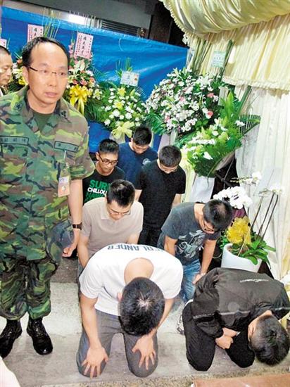 中國臺灣網(wǎng)7月9日消息 據(jù)臺灣《中國時報》報道,臺陸軍五四二旅役男洪仲丘疑因臺軍方操練失當(dāng)身亡,負(fù)責(zé)操練洪男的臺陸軍六軍團(tuán)二六九旅的政戰(zhàn)主任陳毅銘帶領(lǐng)禁閉室室長、副室長及5名戒護(hù)管理員,昨(8)日晚9時許抵達(dá)洪家,在洪靈前上香致意。家屬憤怒表示,沒有獲得臺軍方合理交代,就絕不輕易下葬!爸偾穑瑢Σ黄!我們沒有好好照顧你!标愐沣憥ьI(lǐng)一行人等,在洪仲丘靈堂前上香,并對家屬深深一鞠躬,表示歉意。