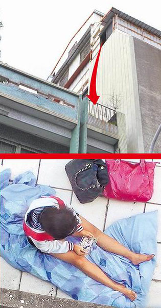 少女從5樓窗口跳到隔壁2樓陽臺(上圖箭頭處)摔斷腿,等待救援還不忘玩手機(jī)。(圖片來自臺媒)