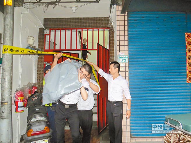 房客殺害房東雙尸案,殯葬業(yè)者將房客遺體運(yùn)出。(圖片來(lái)源:臺(tái)灣《中國(guó)時(shí)報(bào)》)