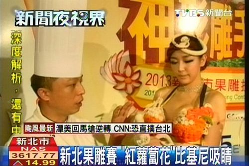 據(jù)臺(tái)灣TVBS網(wǎng)站報(bào)道,臺(tái)灣新北市第二屆果雕競賽,本周六、日即將登場,120組選手角逐總額40萬元(新臺(tái)幣,下同)的獎(jiǎng)金,19日比賽前哨站,特地邀請國際果雕師傅大展刀工,除了5分鐘用水果打造兔子,小鴨等造型,還用紅蘿卜、芋頭雕出比基尼和頭冠,讓現(xiàn)場模特兒穿在身上。