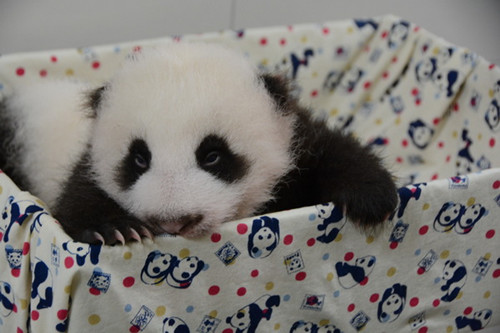 而最近圓仔的眼睛已經(jīng)全開,動物園也幫它挑選大熊貓圖樣的可愛床單,成長紀錄照模樣相當可愛。