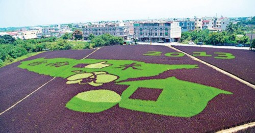 以紫、綠、白3色秧苗交織而成的稻田彩繪位于臺南市后壁區(qū),面積1.4公頃,迎風(fēng)搖曳。今年的圖案有谷倉、米飯與蘭花圖樣。