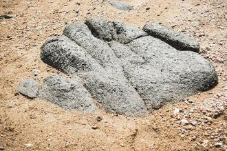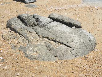 如來神掌石遭海岸作業(yè)挖掘機輾過,小指與無名指明顯遭到破壞。 記者陳向鑫/攝影