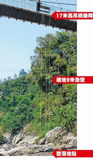 出事的苗栗縣騰龍吊橋高17米,女學生垂降到一半時,因繩索扣環(huán)松脫摔死。(臺媒圖)