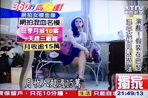 身高170公分的Sora林酉芯,雖然有四分之一荷蘭血統(tǒng),卻是正港臺灣人,入行3年現(xiàn)在是超搶手的網(wǎng)拍界混血名模,要找她拍照一年前就要開始敲通告。碰到旺季,Sora一個月有十幾個活動,一天要連趕3場,月收入超過15萬元。 圖片來源:臺媒