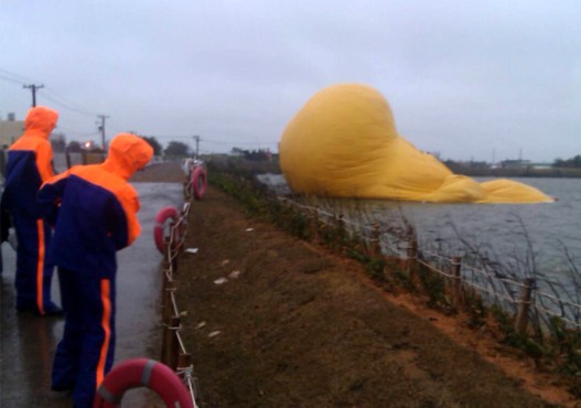 周四晚間,桃園新屋鄉(xiāng)后湖村停電,小黃鴨打氣機無法充氣,屋漏偏逢連夜雨,備用發(fā)電機不明原因停擺,造成小黃鴨漏氣。周五一大早工作人員到場,看到小鴨的狼狽樣,急忙充氣善后。但已有游客到場,拍攝到照片了。