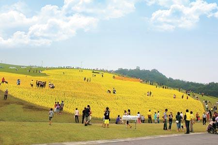 基隆市郊擁恒文創(chuàng)園區(qū)由10萬支風車組合而成,長、寬各80米的超大地景風車大黃鴨隆重登場。(圖片來自臺媒)