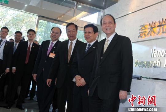 圖為在郭臺(tái)銘(右3)等人陪同下,陳德銘(右2)準(zhǔn)備入內(nèi)參觀!《瓡(huì)峰 攝