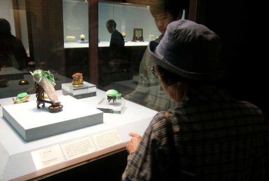 資料圖:兩位游客正在臺(tái)北故宮博物院觀賞國(guó)寶“翠玉白菜”。