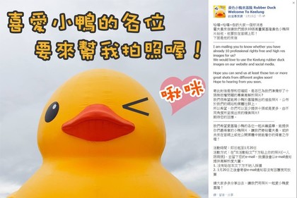 霍夫曼日前寫(xiě)信給基隆主辦單位,要求提供10張高畫(huà)質(zhì)的黃色小鴨照片,照片將會(huì)被登在霍夫曼的官網(wǎng)。主辦單位隨后在臉譜發(fā)布訊息,向民眾征集可愛(ài)的小鴨照片。