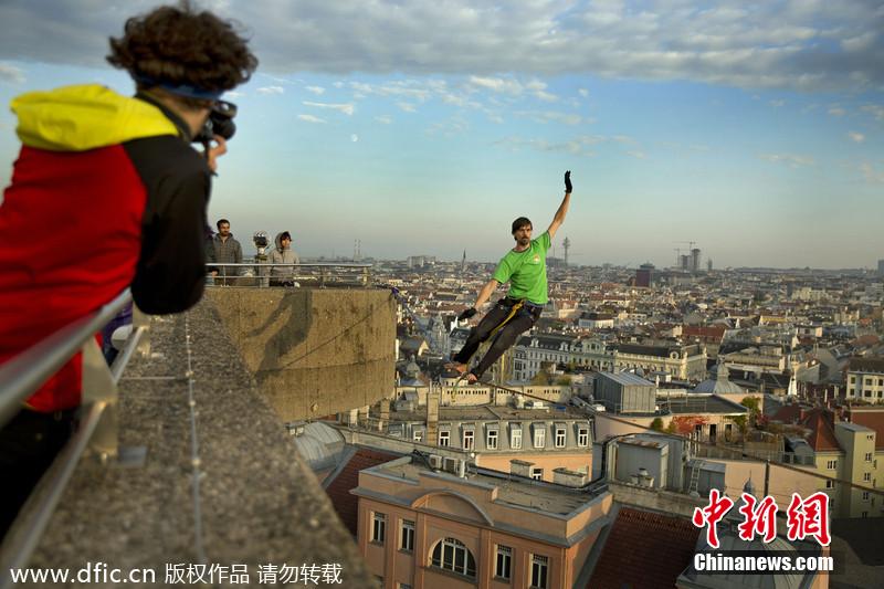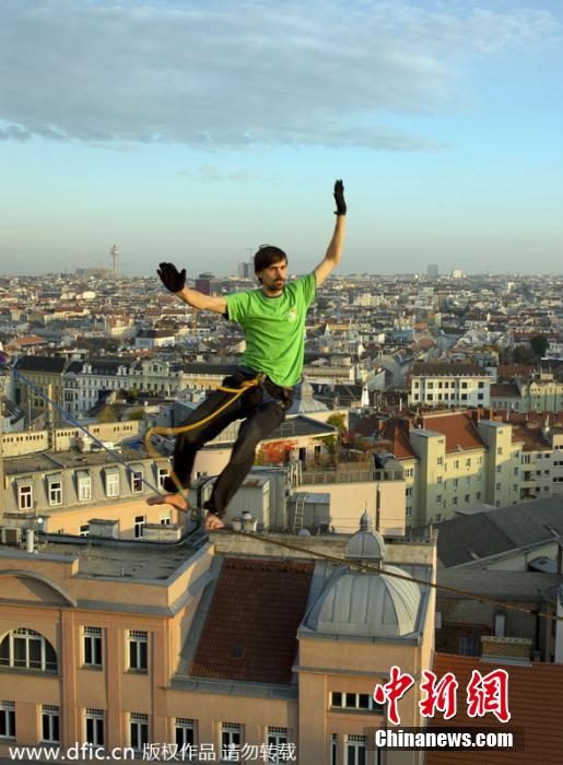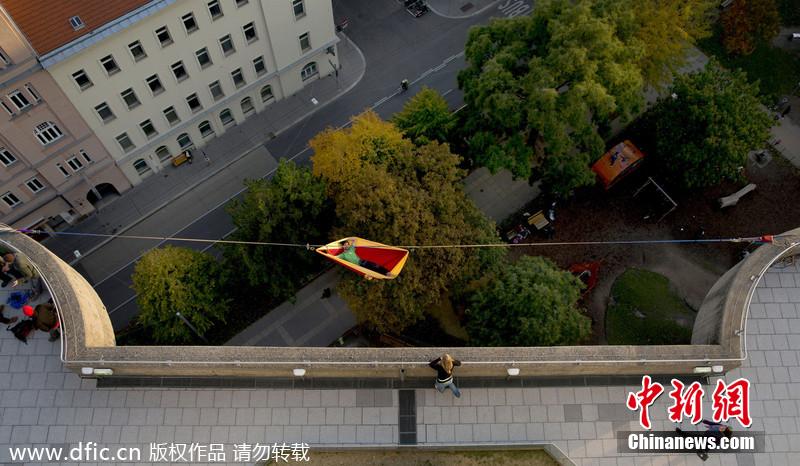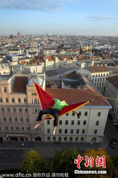 當(dāng)?shù)貢r間2014年1月報道,睡吊床是一件十分愜意休閑的事情,不過這個距離地面100英尺的高空吊床卻只能用毛骨悚然來形容!冒險家Igor Scotland在奧地利維也納離地100英尺的空中拉起鋼絲繩掛起一張吊床,并在吊床中休息和睡覺,向自己的膽量極限發(fā)起挑戰(zhàn),吸引了大批市民駐足觀看,不少圍觀者都為他捏把汗。不過斯科蘭特本人卻悠然自得,不僅靜靜享受腳下的維也納風(fēng)光,還不時在鋼絲繩上表演高超的技藝。圖片來源:東方IC 版權(quán)作品 請勿轉(zhuǎn)載