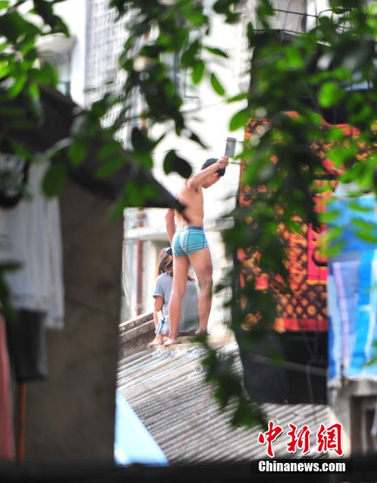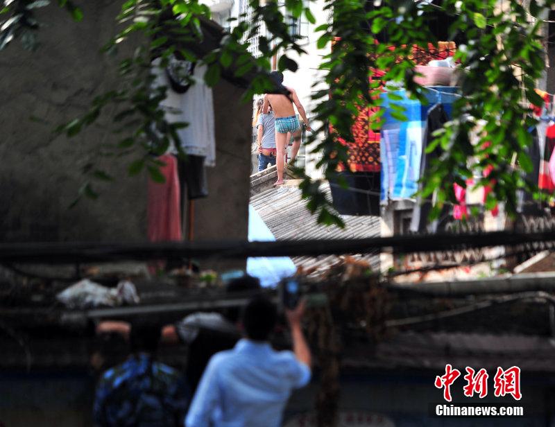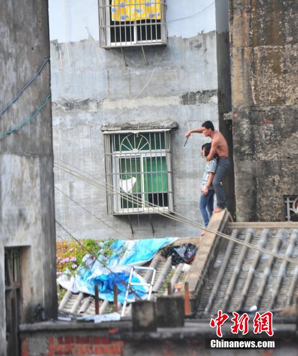 當天下午15時許,在一居民樓樓頂上,一名半裸男子手里拿著一把菜刀,揪著一名半裸女子的頭發(fā),男子情緒異常激動,不停地揮舞手中的菜刀。當時現(xiàn)場已被警方封鎖,數(shù)百名市民圍觀。