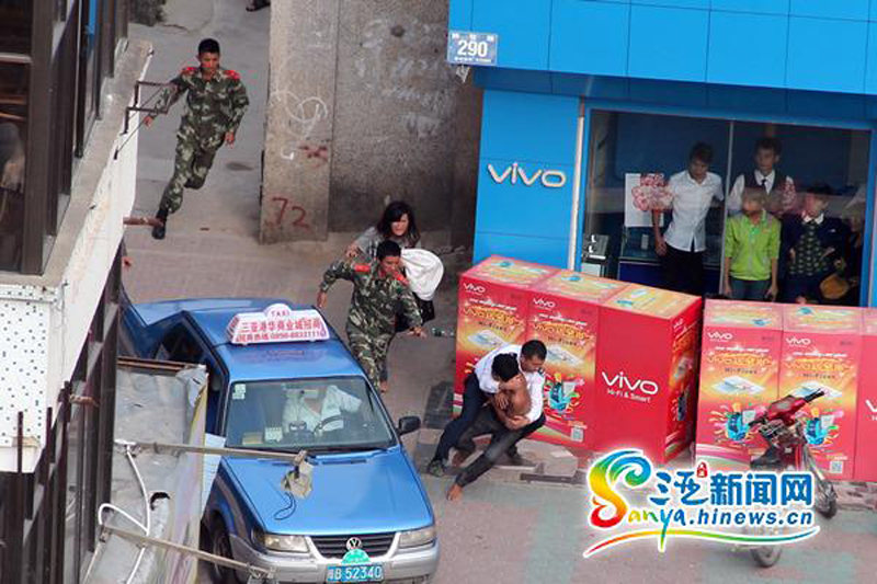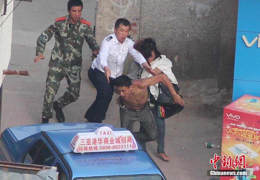 1月20日,位于三亞市建設(shè)街附近有一名半裸男子,手拿菜刀挾持了一名半裸女子。目前,該名男子已被警方控制,具體挾持原因正在進一步調(diào)查之中。圖片來源:CFP視覺中國