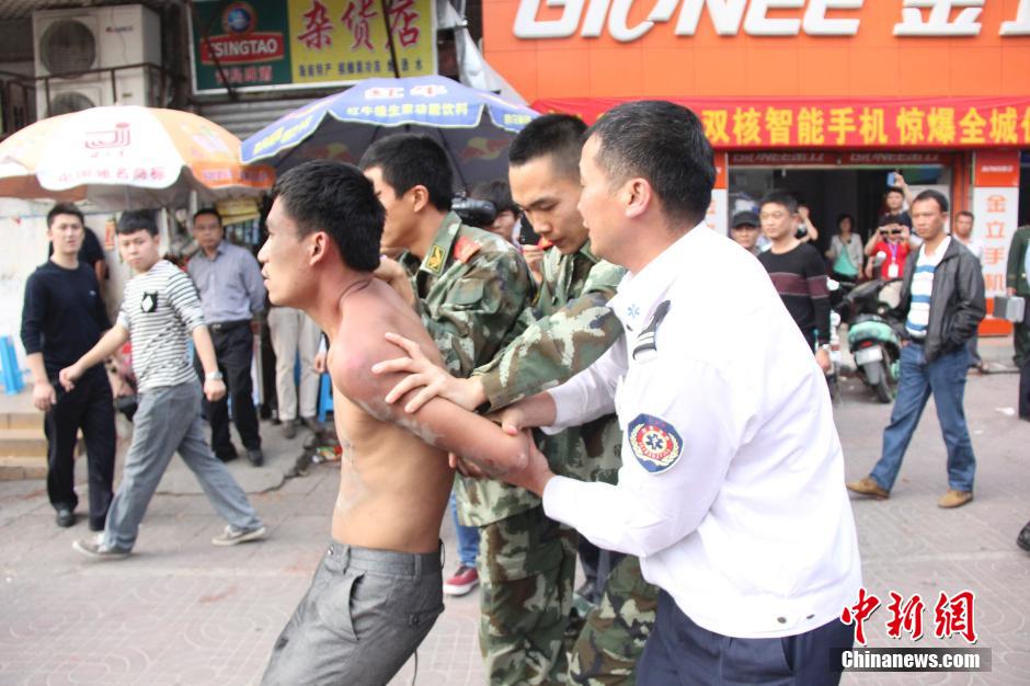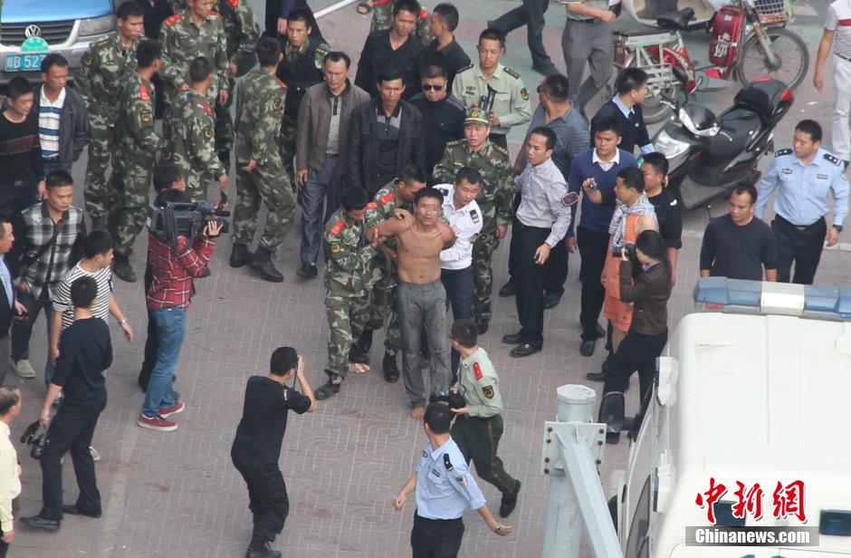 1月20日,海南省三亞市解放二路發(fā)生一起劫持人質(zhì)案件。警方經(jīng)過近5個小時的周旋,制服劫持人質(zhì)的持刀男子,成功解救被劫人質(zhì),人質(zhì)安然無恙。圖為男子被警方制服。中新社發(fā) 周君 攝