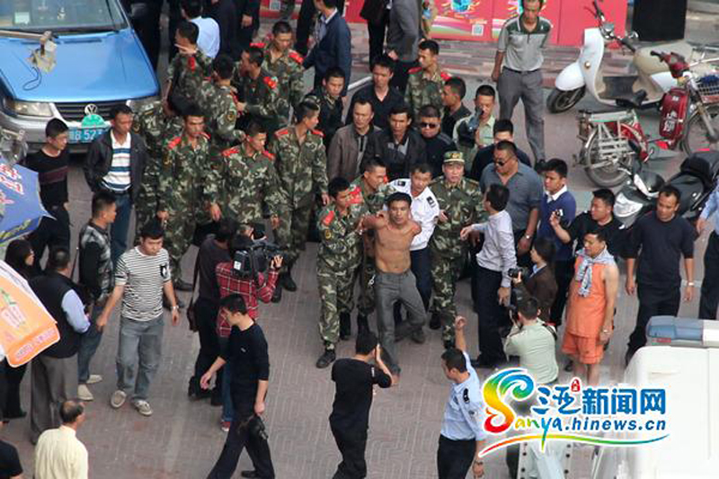 1月20日,位于三亞市建設(shè)街附近有一名半裸男子,手拿菜刀挾持了一名半裸女子。目前,該名男子已被警方控制,具體挾持原因正在進一步調(diào)查之中。鄧松 攝 圖片來源:三亞新聞網(wǎng)