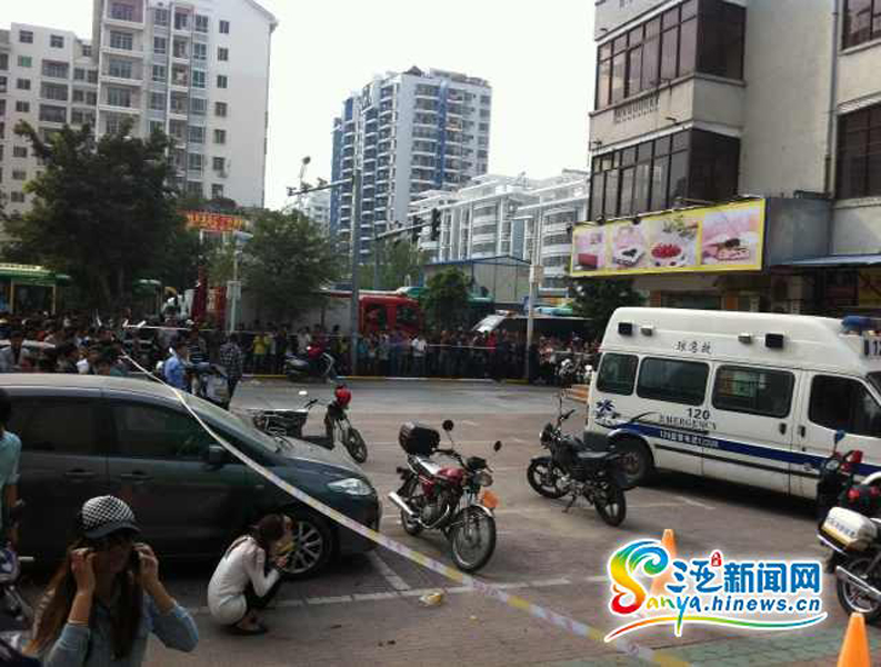 1月20日,位于三亞市建設(shè)街附近有一名半裸男子,手拿菜刀挾持了一名半裸女子。目前,該名男子已被警方控制,具體挾持原因正在進一步調(diào)查之中。圖為圍觀的市民。馬偉元 攝 圖片來源:三亞新聞網(wǎng)