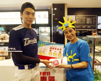 圖為麥當(dāng)勞高雄新澄清餐廳,搶頭香的民眾(左)領(lǐng)第1份免費(fèi)“滿福堡”。 圖/“中央社”