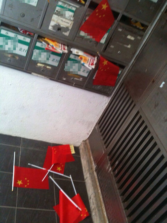 21日清晨富錦街一片紅色旗海,富錦街340至440號(hào)掛滿逾100面五星旗。經(jīng)調(diào)閱監(jiān)視器畫面,發(fā)現(xiàn)凌晨3點(diǎn)多,有3名女子戴著口罩,進(jìn)到小區(qū)里,接著忙插起五星旗,其中在一面信箱墻就插了9支旗子。