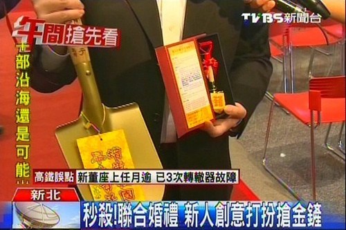 據(jù)報(bào)道,新北市今年的聯(lián)合婚禮預(yù)計(jì)送出專(zhuān)業(yè)婚禮紀(jì)錄DVD、炒菜鍋、臍帶血折價(jià)券和生育套房住宿券等多項(xiàng)好禮,但其中最受注目的還是限量的24K金鏟。