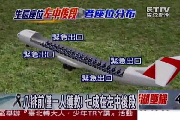 10名生還者中,7人坐在飛機(jī)左側(cè)后段。(圖片來源:臺灣東森新聞)