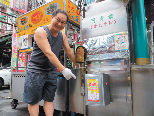 基隆廟口夜市營養(yǎng)三明治攤位貼出衛(wèi)生局稽查合格綠色標章,隔壁賣素食的也貼公告,業(yè)者說雖沒用豬油,為讓消費者放心,“多貼一張沒關系”。